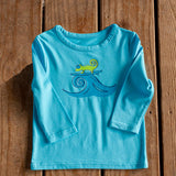 Infant/Toddler Brilliant Cerulean Blue Chameleon Surfing Long Sleeve Sun Protective T-Shirt is a wardrobe essential that can be worn by itself or layered. Lightweight and cool for year-round comfort indoors and outdoors. Exclusive bamboo blend provides UPF 50+ sun protection that won’t wash out.